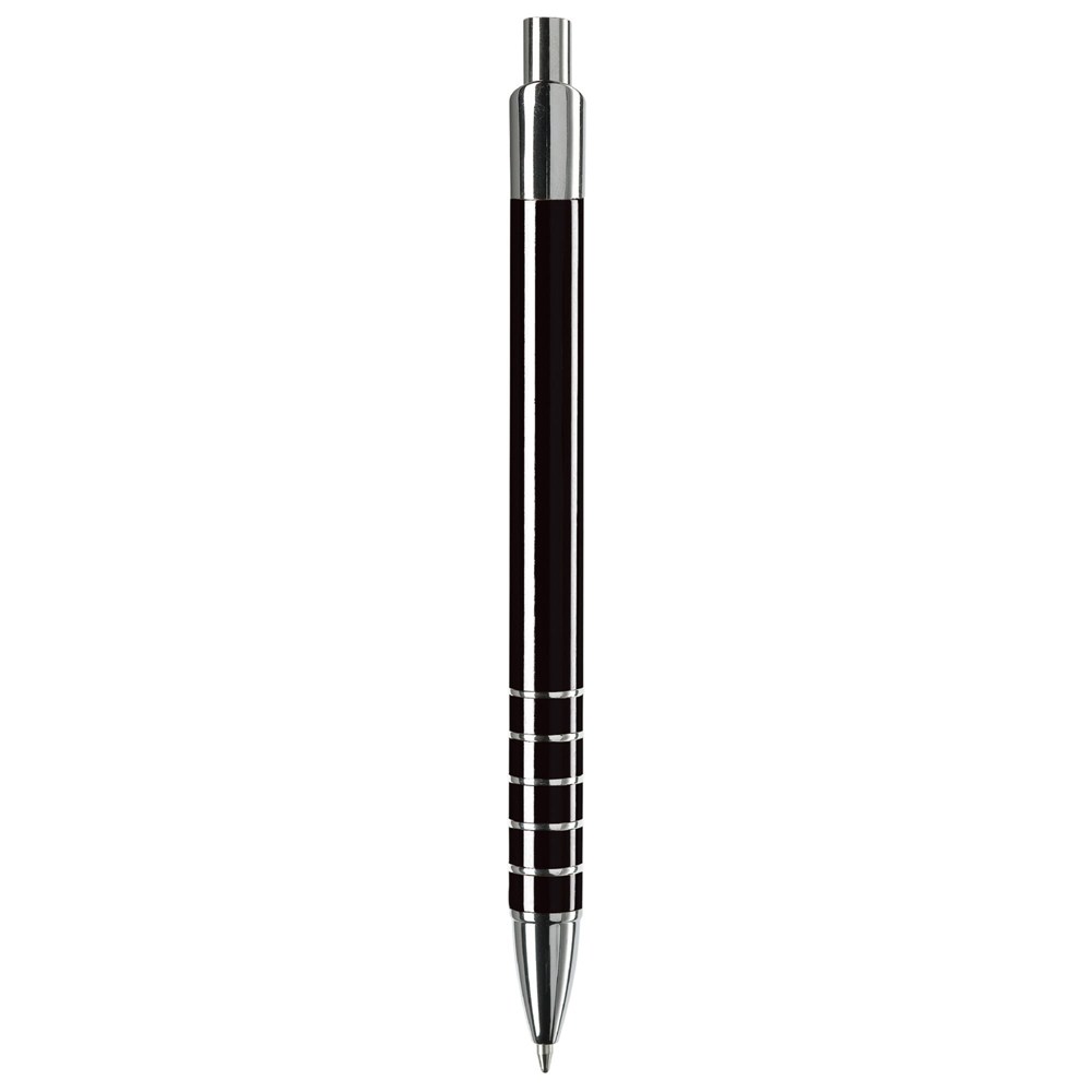 Schlanker Aluminium Kugelschreiber mit 5 chromfarbenden Ringen in der Griffzone und chromfarbenden Teilen. Schwarzschreibende Kunststoffmine.