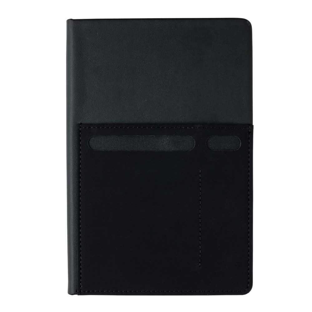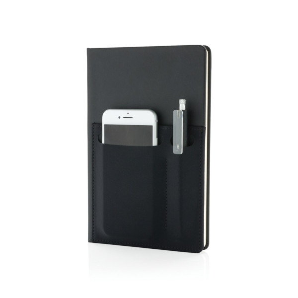 A5 Notizbuch mit 160 cremefarbenen Seiten, liniert, 80g/m². Auf dem FrontCover ein Fach für Ihr Smartphone sowie einen Stift und einem größeren Fach für Dokumente. Smartphone für Geräte bis zu 8cm Breite ( wie z.B. iPhone 7 plus).