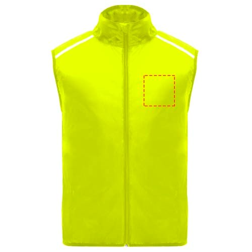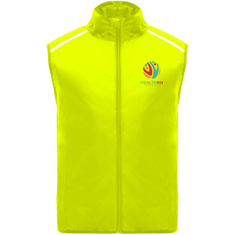 Leichte Funktions - Laufweste, winddicht und atmungsaktiv. Frontreißverschluss mit passendem Kinnschutz. Elastische Einfassung am Armausschnitt und Saum. Untere Rückenpartie aus mikroperforiertem Stoff. Reflektierende Details auf den Schultern, Front- und Rückseite. Tasche mit elastischem Band zum Verstauen der Weste und zum Tragen am Handgelenk. Abnehmbares Etikett.