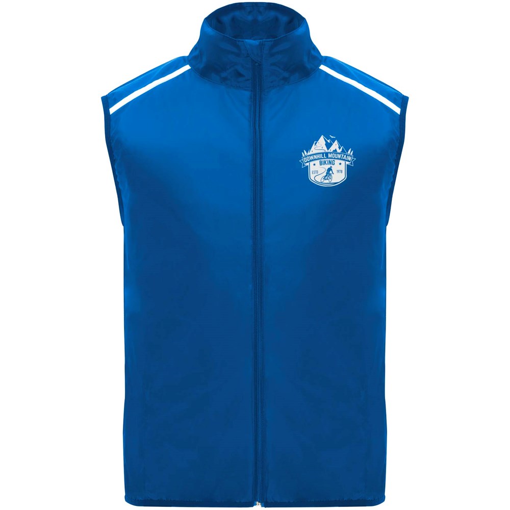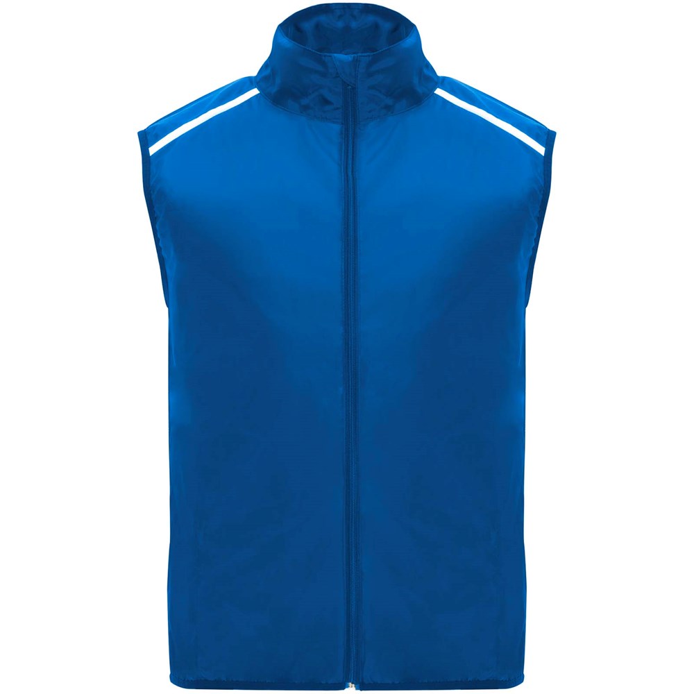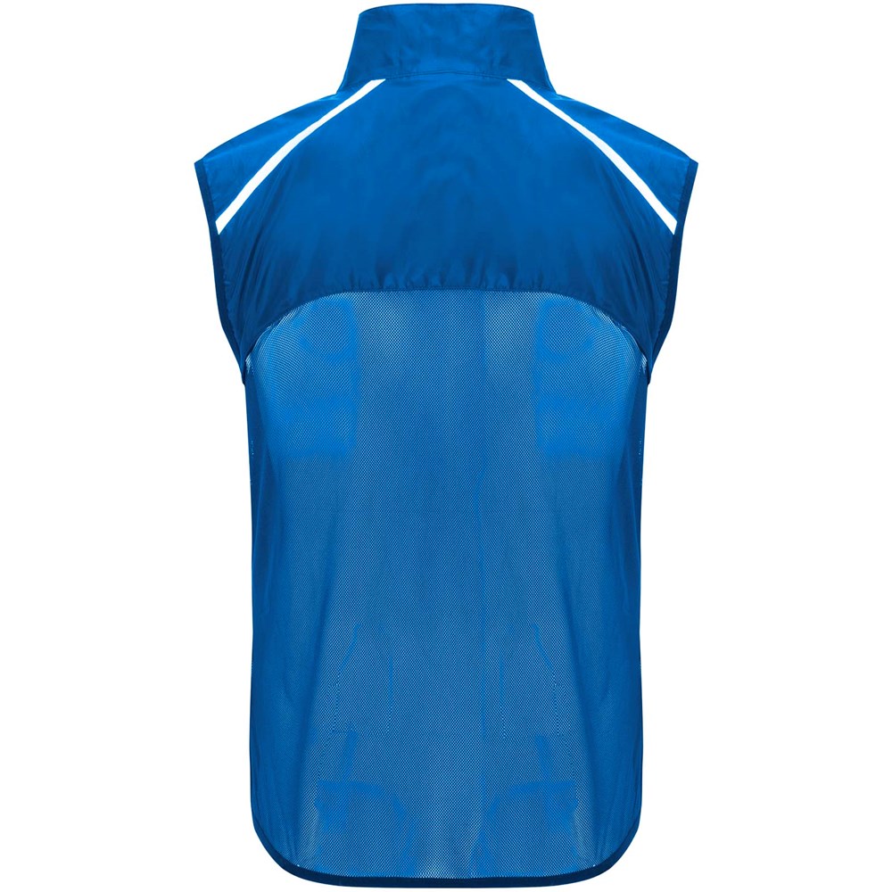 Leichte Funktions - Laufweste, winddicht und atmungsaktiv. Frontreißverschluss mit passendem Kinnschutz. Elastische Einfassung am Armausschnitt und Saum. Untere Rückenpartie aus mikroperforiertem Stoff. Reflektierende Details auf den Schultern, Front- und Rückseite. Tasche mit elastischem Band zum Verstauen der Weste und zum Tragen am Handgelenk. Abnehmbares Etikett.