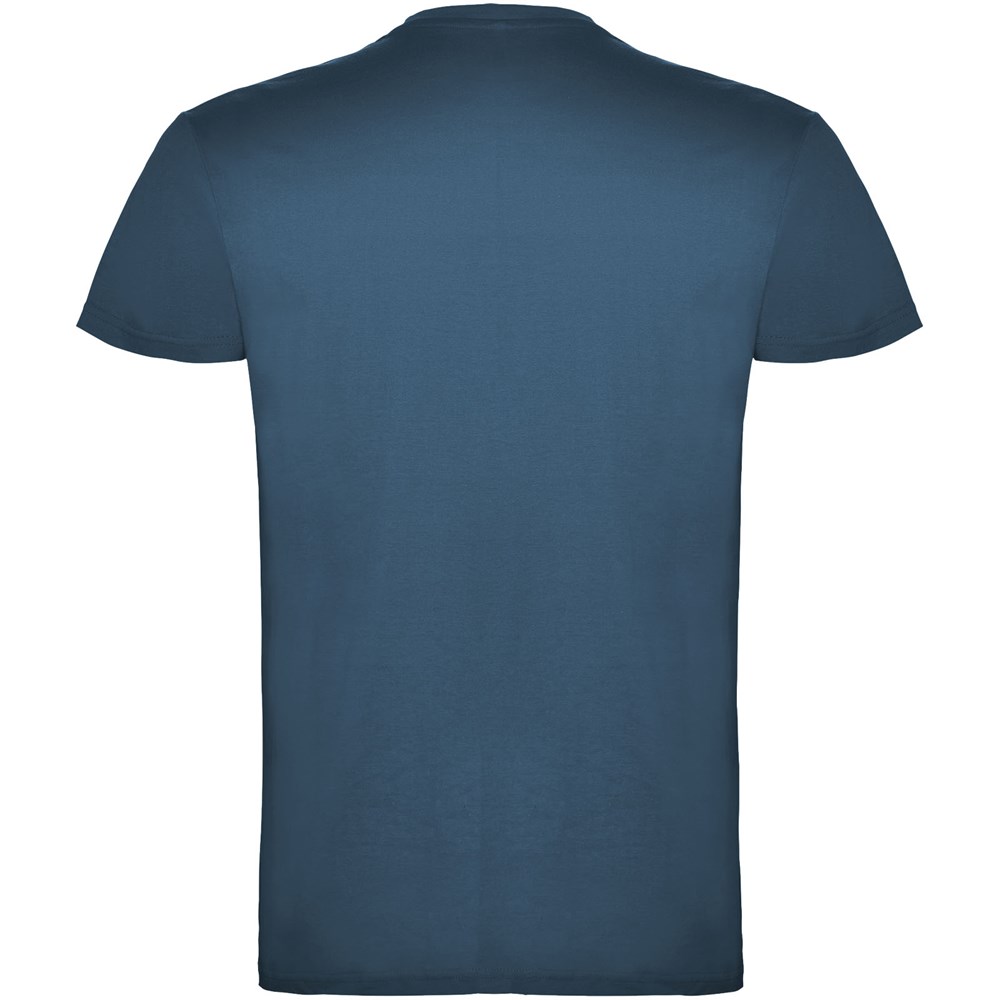 Kurzärmeliges T-Shirt mit doppellagigem Rundhalsausschnitt aus Elasthan, hergestellt aus schlauchförmigem Material für Erwachsene. Verstärkte und verdeckte Nähte am Kragen. Herausnehmbares Etikett. Das Modell ist 190 cm groß und trägt Größe L.