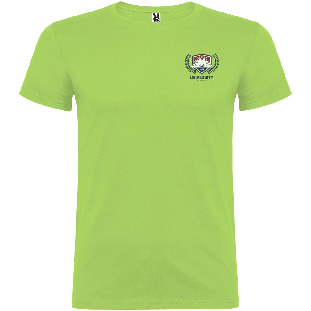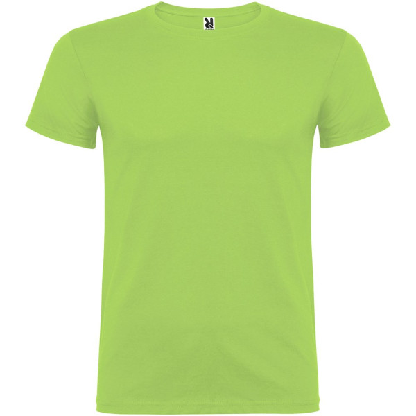 Kurzärmeliges T-Shirt mit doppellagigem Rundhalsausschnitt aus Elasthan, hergestellt aus schlauchförmigem Material für Erwachsene. Verstärkte und verdeckte Nähte am Kragen. Herausnehmbares Etikett. Das Modell ist 190 cm groß und trägt Größe L.