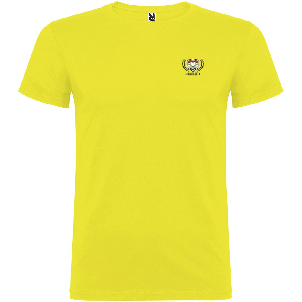Kurzärmeliges T-Shirt mit doppellagigem Rundhalsausschnitt aus Elasthan, hergestellt aus mit Seitennähten. Verstärkte und verdeckte Nähte am Kragen. Herausnehmbares Etikett. Das Modell ist 120 cm groß und trägt Größe 5/6.