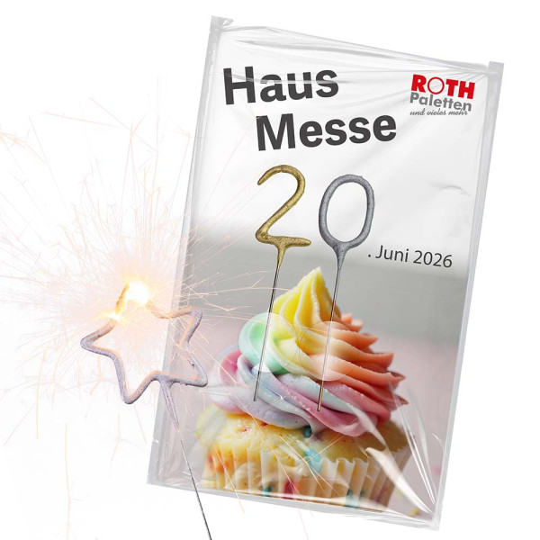 Das Wondercandle-Set setzt Markenbotschaften glanzvoll in Szene. Die individuell gestaltbare Karte im Format 195 × 120 mm bietet großzügigen Raum für Werbebotschaften. Montiert werden können bis zu vier Wunderkerzen, wahlweise als Zahlen von 0–9, Herz, Stern (jeweils in Gold, Silber oder Rosé) sowie als Buchstaben LOVE. Die Karte wird einzeln in Cellophanhüllen verpackt und eignen sich ideal für Promotions, Jubiläen, Events oder festliche Kampagnen. Ein Werbeartikel, der sofort Aufmerksamkeit erzeugt und positiv im Gedächtnis bleibt.