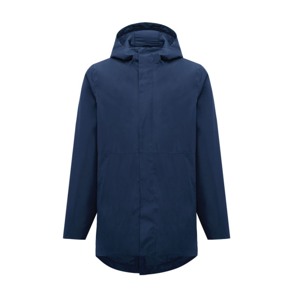 Unisex-Parka mit Wattierung, 4000mm wasserdicht, aus 100% recyceltem Polyester, atmungsaktiv & windabweisend. Er hat alle Merkmale eines klassischen Parkas: längere Rückenlänge, Rückenschlitz, 2-Wege-CF-Reverse-Reißverschluss, verdeckt durch eine Frontleiste mit vier verdeckten Druckknöpfen, Ärmelbündchen mit Innenmanschette, Kapuze mit Stoppern, horizontale Ziernähte. Er ist mit Sheets aus 100% recyceltem Polyester gefüttert und mit feinem Taft unterlegt. Auf der Innenseite hat er einen versteckten Reißverschluss am unteren Saum und auf der linken Brustseite des Trägers, das erleichtert eine Veredelung. Der gesamte Parka ist mit recyceltem Polyester-Garn genäht. Im Nacken hat er ein abreißbares Größenetikett. Die Verwendung von recyceltem Material und die Angaben zur Umweltverträglichkeit werden durch den Einsatz des disruptiven physikalischen Tracers AWARE™ und der Blockchain-Technologie garantiert. Durch Scannen des QR-Codes erhalten Sie Zugang zu einem speziellen digitalen Pass.
