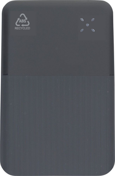 Powerbank aus recyceltem ABS mit 10.000 mAh Lithium-Ionen-Akku und 22,5 W Schnellladefunktion. Mit Typ-C-Ein- und -Ausgang sowie Typ-A-Eingang. Das Gehäuse besteht zu einem Drittel aus glatter Oberfläche für Drucke und zu zwei Dritteln aus strukturiertem Relief. Die digitale Anzeige auf der Oberseite zeigt die Akkukapazität an. Schützt vor Überhitzung, Kurzschluss, Überspannung und Überstrom. Auf der Rückseite befindet sich ein Etikett mit dem Logo aus recyceltem ABS. Einzeln verpackt in einem braunen Karton mit Seidenpapier.