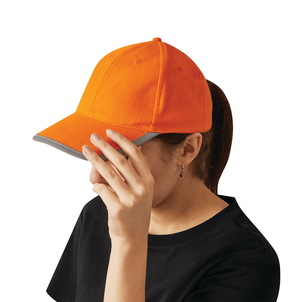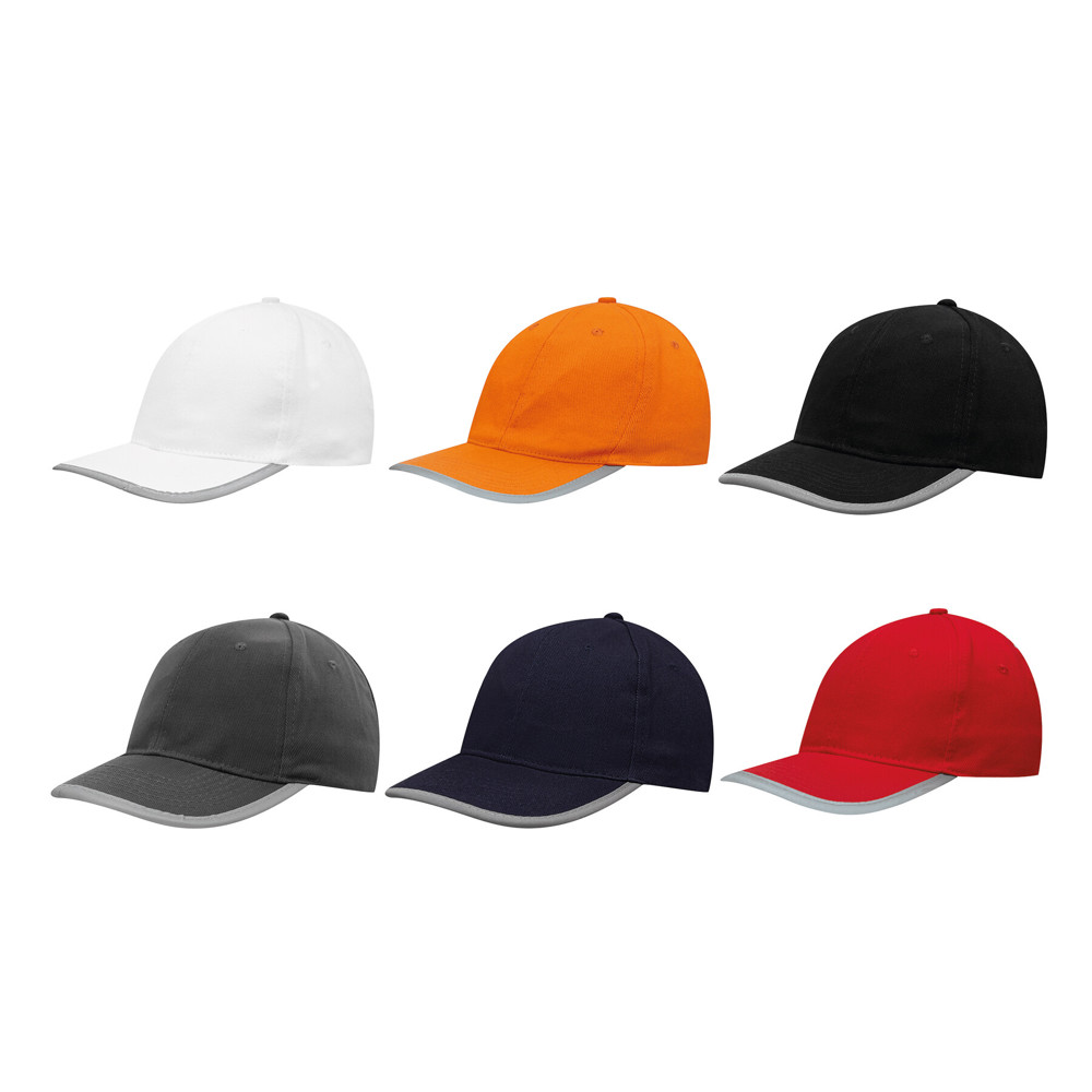 6-Panel-Baseball-Cap DETECTION: mit reflektierendem Band an Schirm und hinten auf dem Klettverschluss, verstärkte Frontsegmente, 6 gestickte Luftlöcher, Knopf, 100% Baumwolle (heavy-brushed)