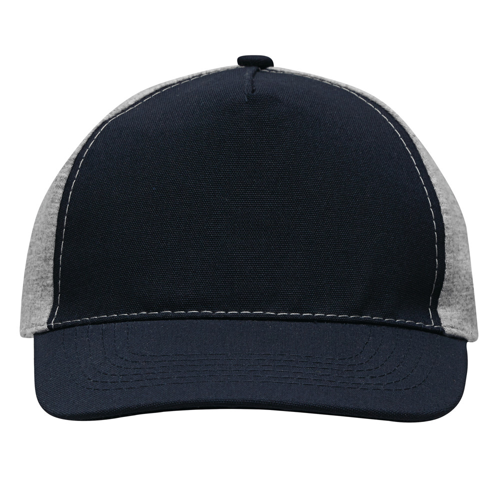5-Panel-Baseball-Cap UP TO DATE, 2-farbig: verstärktes Frontsegment in Canvas-Optik, übrige Segmente aus Jersey, 4 gestickte Luftlöcher, Knopf, farbig abgesetzter und größenverstellbarer Klettverschluss am Hinterkopf