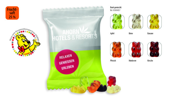 Die kleinen saftigen Bärchen bieten ein intensives Fruchtgummi-Erlebnis. Mit einem Fruchtsaftanteil von 25 % und einer weichen Konsistenz sind diese Bärchen der perfekte fruchtige Snack für unterwegs, der jede Tüte mit saftigem Geschmack füllt. , Geschmac