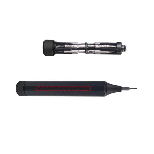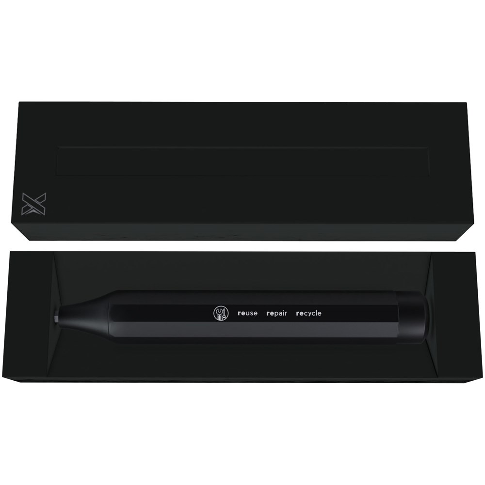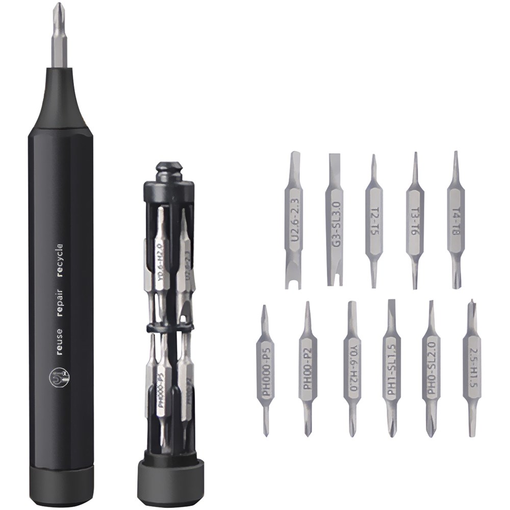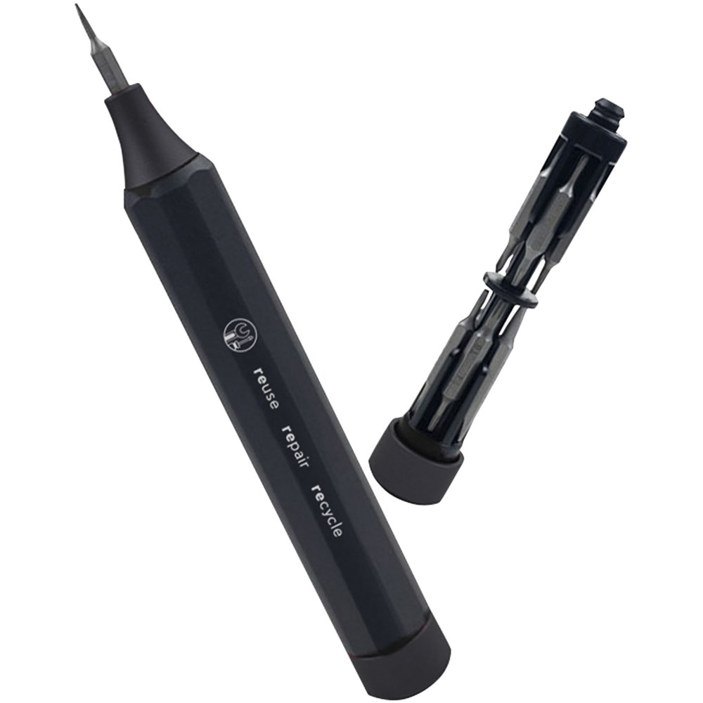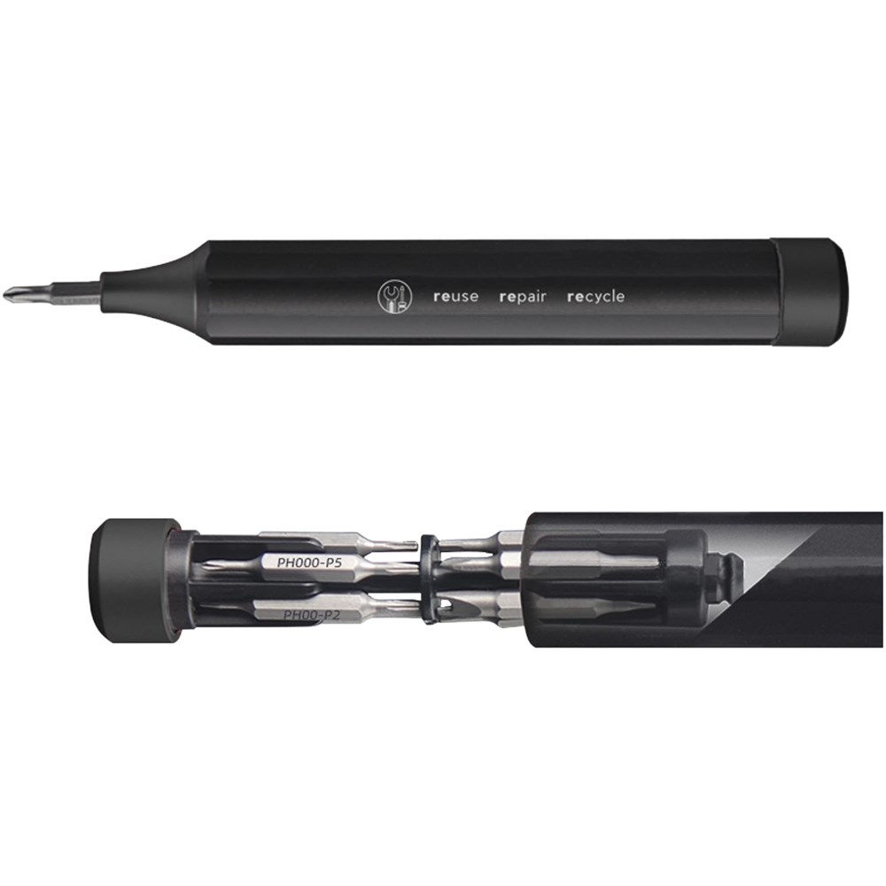 Präzisionsschraubendreher-Set aus Aluminium mit 10 versteckten Doppelkopf-Bits. Die verschiedenen Bits werden mit einer magnetischen Funktion am Schraubendreherstift befestigt und können für die meisten technischen Geräte verwendet werden. Dieses Produkt kann mit einer Lasergravur individuell gestaltet werden. Wird in einer recycelten Papier- Geschenkbox geliefert.