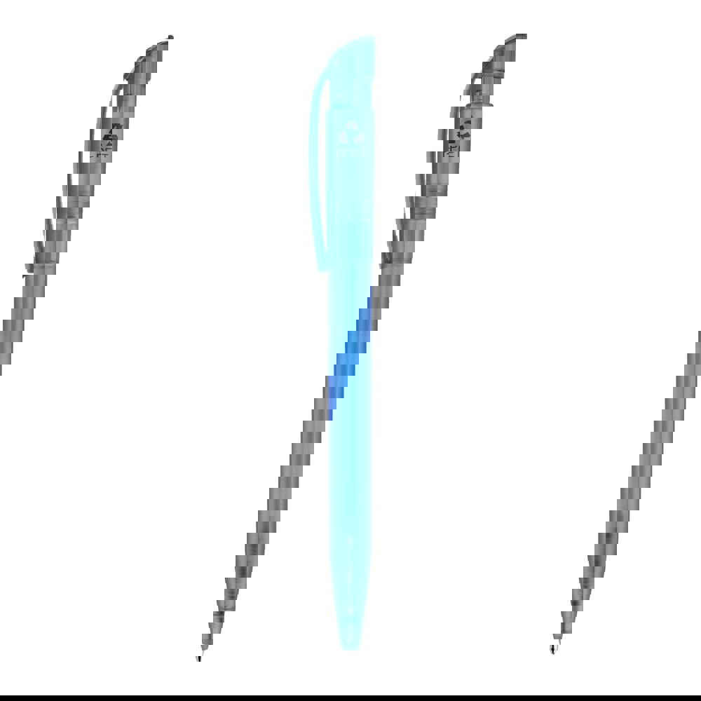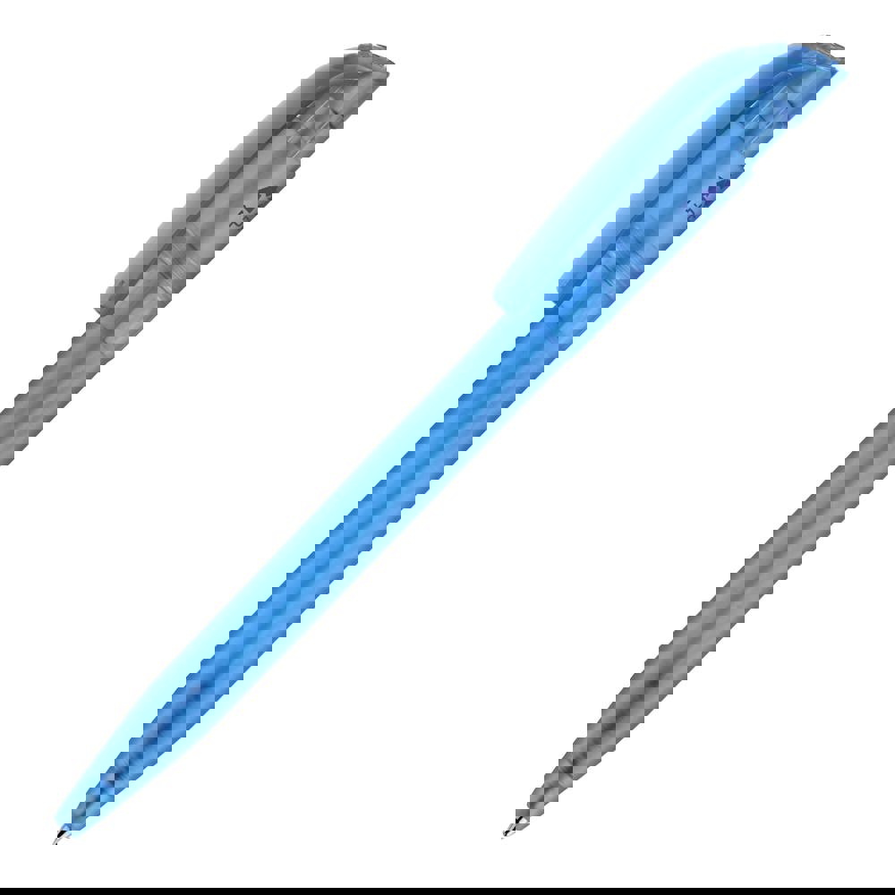 Moderner transparenter Kugelschreiber mit einem gebogenen Clip aus R-PET-Material. R-PET bedeutet recycelten PET-Kunststoff. Mit einer großen Druckfläche ist es ein idealer Werbeartikel. Der Druckkugelschreiber wird mit einer blau schreibenden X20-Refill-Mine geliefert.