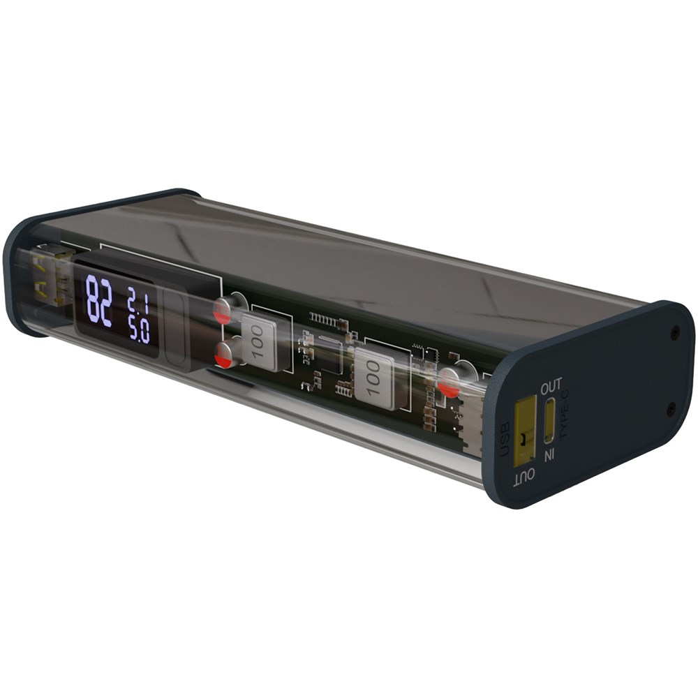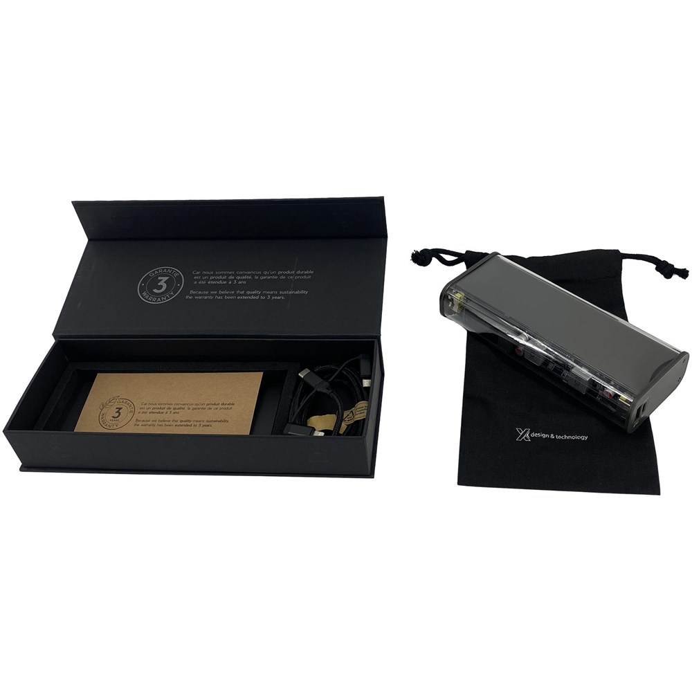 Diese transparente und tragbare 20.000-mAh-Powerbank ist der perfekte Begleiter zum Aufladen eines Laptops auf Reisen oder bei der Remotearbeit. Die Powerbank verfügt über ein 3-in-1-Ladekabel mit 5 A, einen dualen USB-A-Ausgang und einen USB-C-Anschluss. Sie wird mit einem Beutel aus Recyclingbaumwolle geliefert, in dem Sie sie auf Reisen oder beim Pendeln leicht verstauen können. Größe der Powerbank: 15,4 × 6,6 × 3,2 cm. Verpackt in einer Geschenkbox aus recyceltem Papier (23,15 × 8,75 × 3,9 cm) mit Magnetverschluss. Inklusive 3 Jahre Garantie.