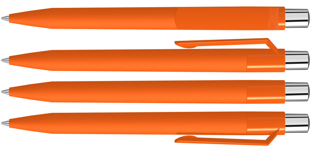 Druckkugelschreiber mit Softtouch-Schaft, gedeckt glänzendem Clip, silber glänzendem Drücker und farbigem Stopfen.