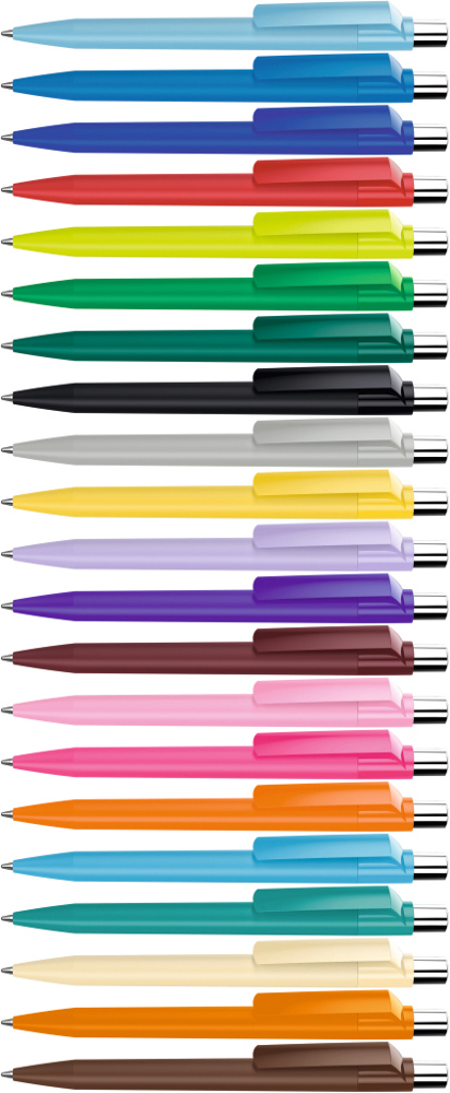 Druckkugelschreiber mit Softtouch-Schaft, gedeckt glänzendem Clip, silber glänzendem Drücker und farbigem Stopfen.