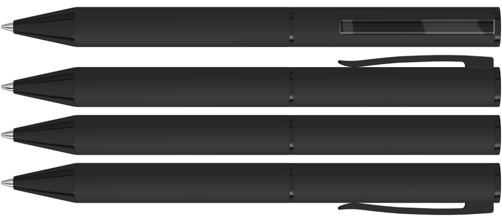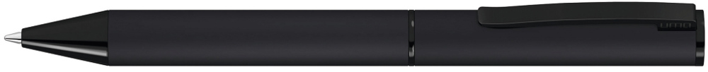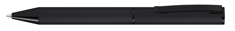 Metall-Drehkugelschreiber mit Softtouch-Gehäuse, Softdrehmechanik und gefedertem Metallclip. Beschlagteile schwarz glänzend lackiert.