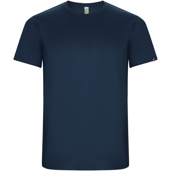 Funktions-T-Shirt aus recyceltem Polyester CONTROL DRY. Rundhalsausschnitt mit farblich abgesetzten Nähten. ECO-Logo-Etikett am Ärmel. Verpackung aus Recyclingmaterial. Herausnehmbares ECO-Etikett. Verpackung aus Recyclingmaterial. Technisches Gewebe. Das Modell ist 180 cm groß und trägt Größe M.