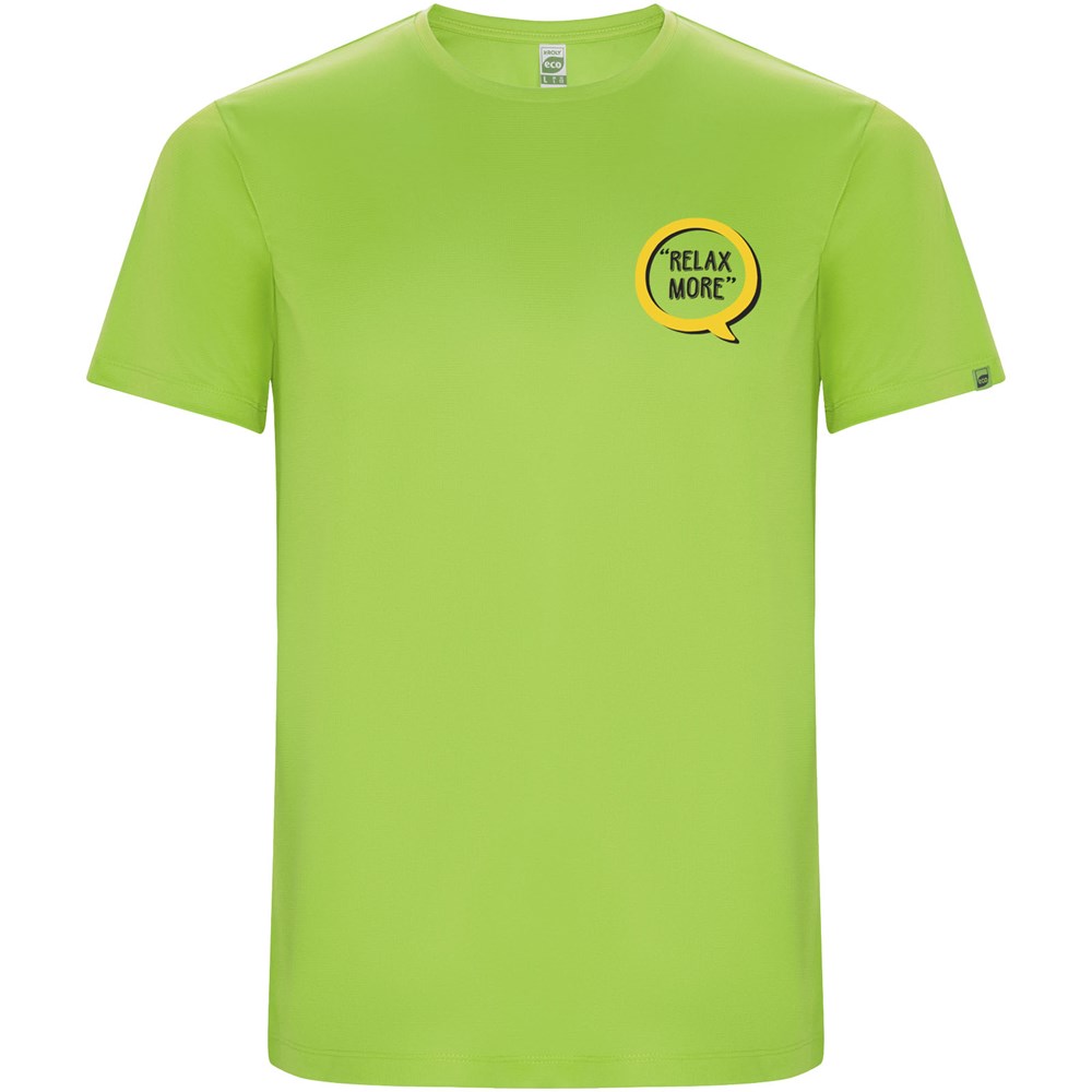 Funktions-T-Shirt aus recyceltem Polyester CONTROL DRY. Rundhalsausschnitt mit farblich abgesetzten Nähten. ECO-Logo-Etikett am Ärmel. Verpackung aus Recyclingmaterial. Herausnehmbares ECO-Etikett. Verpackung aus Recyclingmaterial. Technisches Gewebe. Das Modell ist 180 cm groß und trägt Größe M.