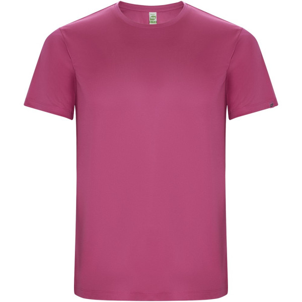 Funktions-T-Shirt aus recyceltem Polyester CONTROL DRY. Rundhalsausschnitt mit farblich abgesetzten Nähten. ECO-Logo-Etikett am Ärmel. Verpackung aus Recyclingmaterial. Herausnehmbares ECO-Etikett. Verpackung aus Recyclingmaterial. Technisches Gewebe. Das Modell ist 180 cm groß und trägt Größe M.