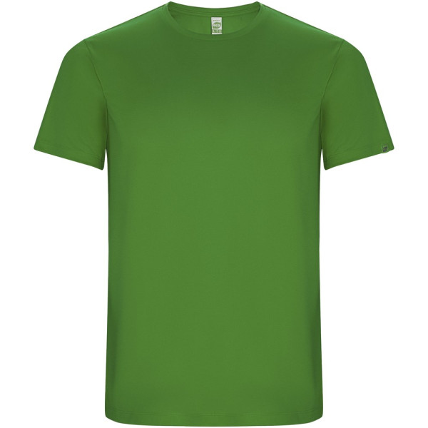 Funktions-T-Shirt aus recyceltem Polyester CONTROL DRY. Rundhalsausschnitt mit farblich abgesetzten Nähten. ECO-Logo-Etikett am Ärmel. Verpackung aus Recyclingmaterial. Herausnehmbares ECO-Etikett. Verpackung aus Recyclingmaterial. Technisches Gewebe. Das Modell ist 180 cm groß und trägt Größe M.
