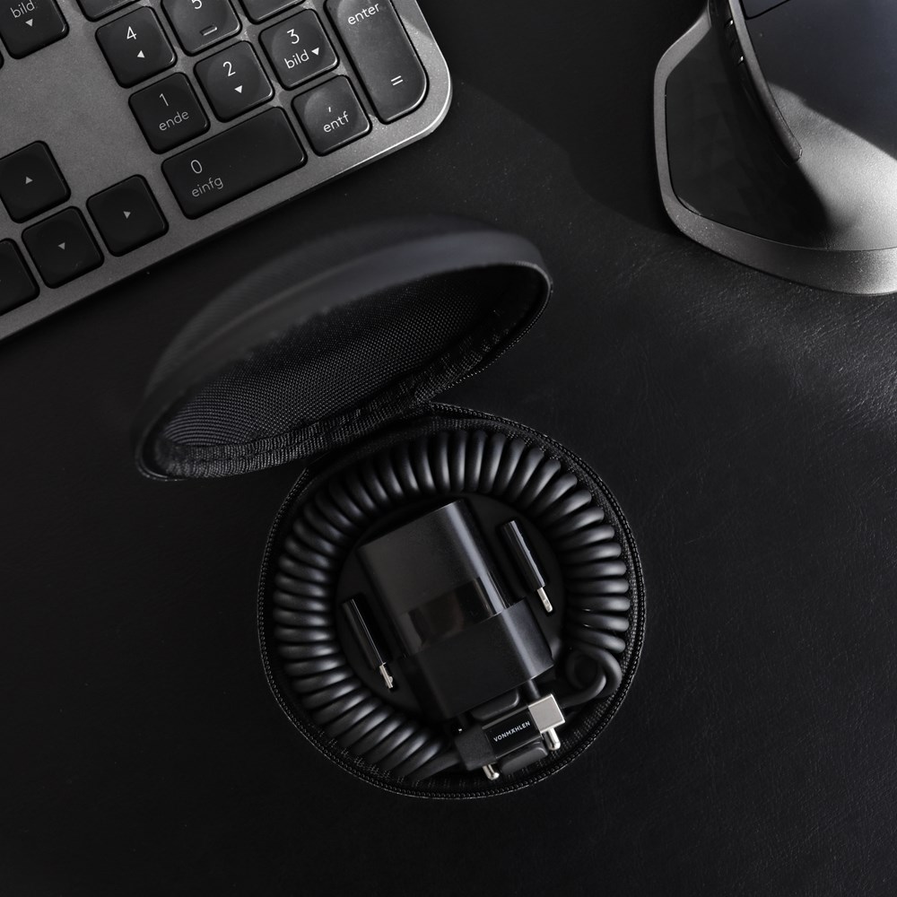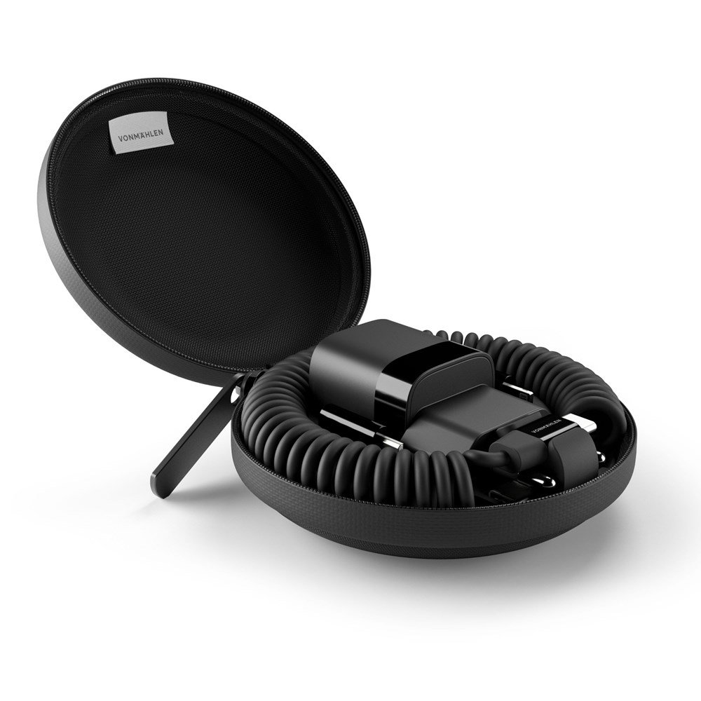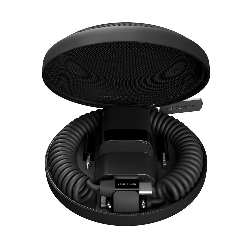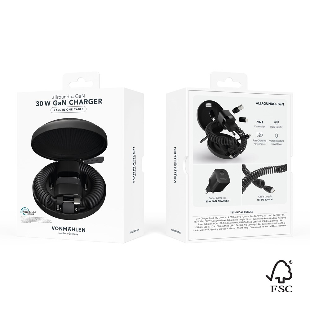 allroundo® GaN ist Vonmählen's GaN Power-Charger (30 W) und verfügt über ein integriertes All-in-One Lade- und Datenkabel (120 cm) mit dem du alle deine Endgeräte blitzschnell (bis zu 60W) aufladen kannst. Bequem verstaut im minimalistischen Reise Case, sind die integrierten Adapter (USB-A, Micro-USB und Lightning) jederzeit perfekt geschützt, was allroundo® GaN zu einem besonders langlebigen und treuen Begleiter macht. UVP: 49,99€