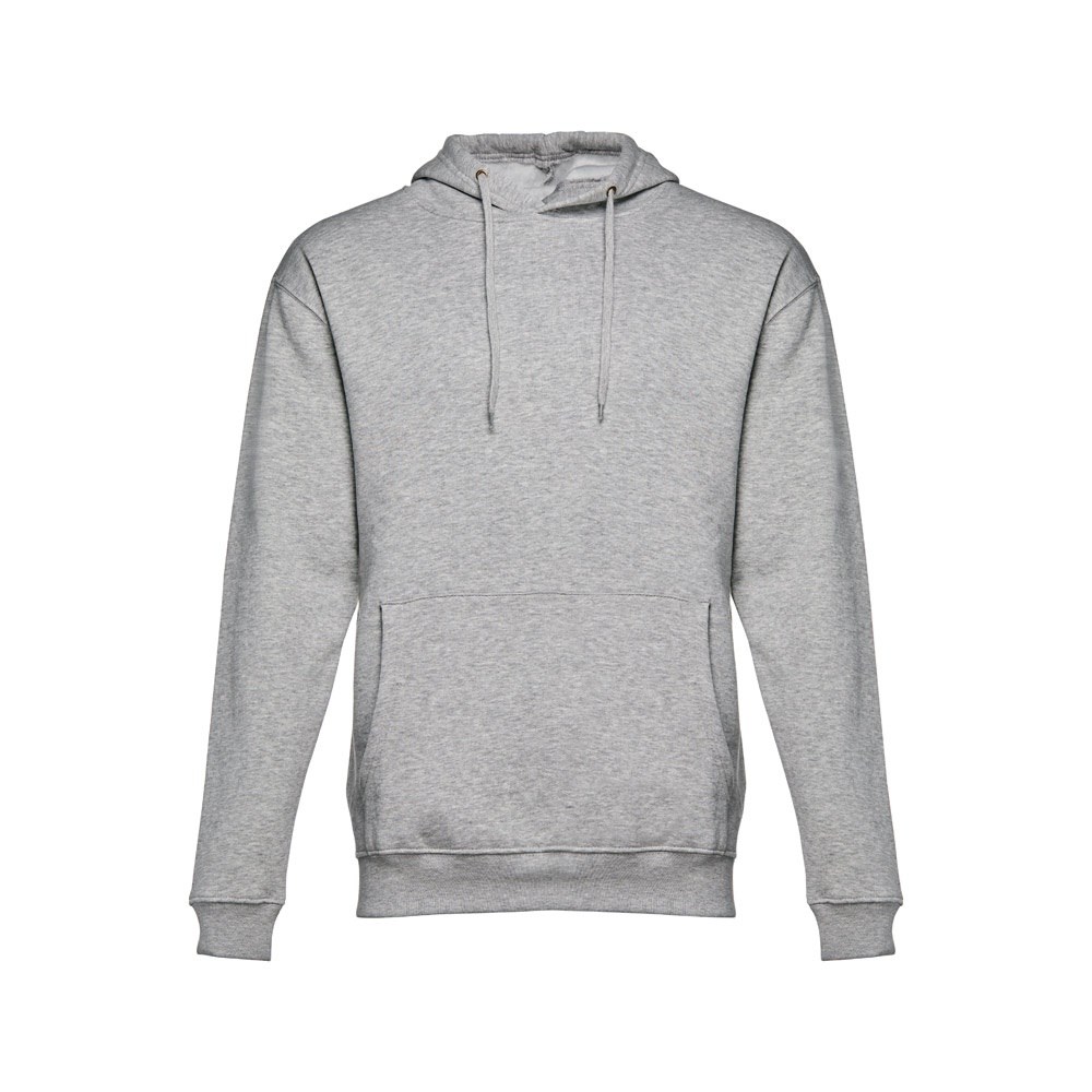 Sweatshirt aus 50% Baumwolle und 50% Polyester (320g/m²), unisex mit einer Kapuze mit Kordelzug. Innen kardiert, 1x1 Ripp, Bund an Ärmel und einer Kängurutasche. Größen: XS, S, M, L, XL, XXL