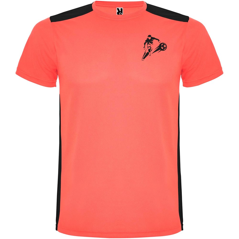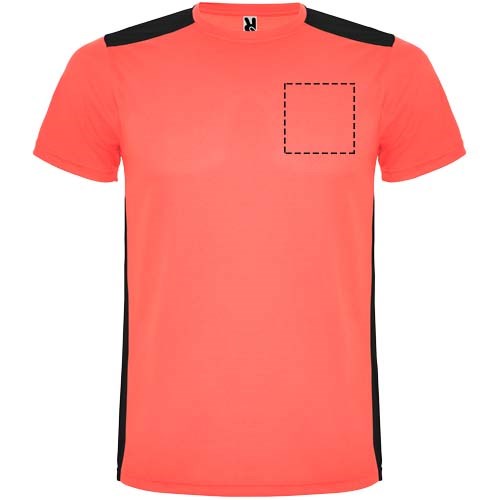 Funktions-T-Shirt aus atmungsaktivem Stoff. Rundhalsausschnitt. Kombination aus zwei Polyestergeweben im Rücken- und Schulterbereich. Polyester Bienenwabe Vorne und 3D-Netz Polyester auf Schulter und Rücken. Material ist feuchtigkeitabsorbierend. Ziernähte auf den Schultern und Seiten. Schnitt mit verlängertem Rückenteil. Abnehmbares Etikett.