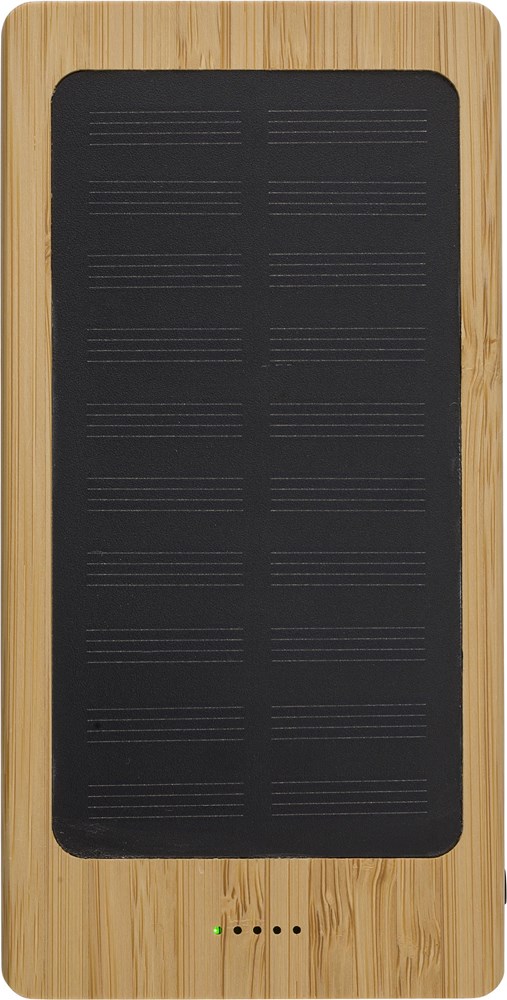 Solar-Powerbank aus Bambus mit einer Kapazität von 8.000 mAh, zwei USB-Anschlüssen und einem Mikro-USB-Anschluss sowie vier LED-Anzeigen. Eingang: DC 5V/2A, Ausgang: Gleichstrom 5V/2A. Inklusive Kabel.