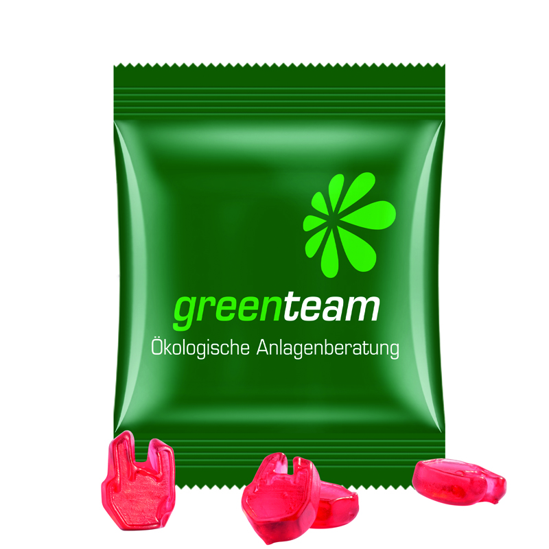Trolli Fruchtgummi Sonderform in Tüte aus weißer Folie, kompostierbar, individuell bedruckt. Inhalt: Trolli Fruchtgummi in Sonderform nach eigenem Wunsch in Premium Qualität mit 10 % Fruchtsaftanteil, bunt gemischt Fruchtgummi Größe: Max. 15 x 15 mm Sonderformen in Fruchtsaftqualität Exquisit auf Anfrage, 10 g