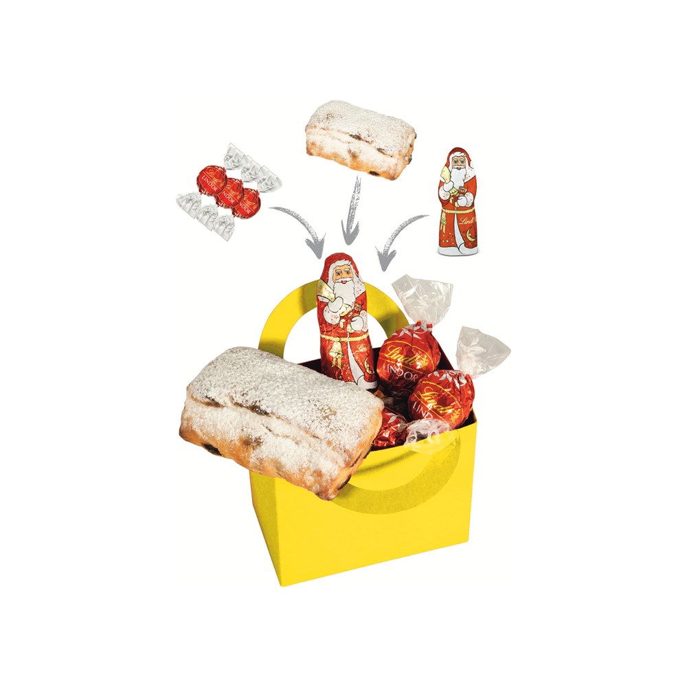 1 schicke Weihnachtstüte Rot gefüllt mit: 1 Gourmet-Christstollen 80 g, 3 zartschmelzende Lindt Lindor Kugeln, je 12,5 g und 1 Lindt Weihnachtsmann 10 g. • Bunt und nachhaltig: die ColorBag ist ein Naturprodukt "MADE IN GERMANY" und wird aus 100% Recyclingpapier hergestellt. 4 leuchtende Farben sind erhältlich: blau, gelb, grün und rot. Die ColorBag kann auf Wunsch mit einem 1c Druck oder einem 4c Aufkleber individualisiert werden.
