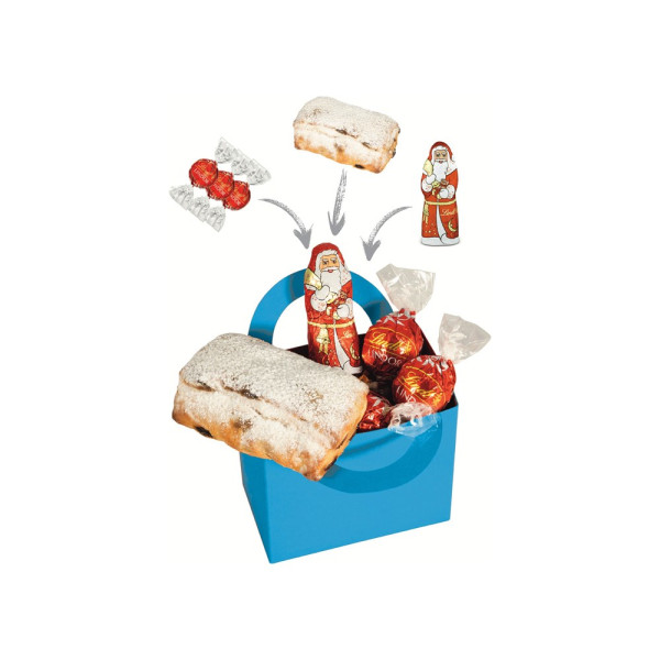 1 schicke Weihnachtstüte Rot gefüllt mit: 1 Gourmet-Christstollen 80 g, 3 zartschmelzende Lindt Lindor Kugeln, je 12,5 g und 1 Lindt Weihnachtsmann 10 g. • Bunt und nachhaltig: die ColorBag ist ein Naturprodukt "MADE IN GERMANY" und wird aus 100% Recyclingpapier hergestellt. 4 leuchtende Farben sind erhältlich: blau, gelb, grün und rot. Die ColorBag kann auf Wunsch mit einem 1c Druck oder einem 4c Aufkleber individualisiert werden.