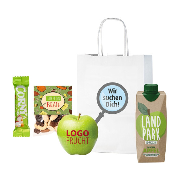 1 LOGOFrucht Apfel grün inkl. LOGOFrucht-Druck Strawberry, 1 Papiertragetasche mit gedrehten Papierkordeln inkl. Standard-Druck "Apfel", 1 Corny Riegel Apfel 25 g, 1 Beutel Studentenfutter 40 g und 1 Landpark Bio-Quelle Sanfter Apfel 500 ml (Erfrischungsgetränk, stilles Bio-Mineralwasser mit Apfel-Geschmack) • Der Apfel wird mit einem schonenden Druckverfahren und hochwertigen Lebensmittelfarbstoffen bedruckt, es stehen 6 Druckfarben zur Verfügung: Raspberry, Kiwi, Strawberry, Hazelnut, Blackberry und Goldberry. Im Gegensatz zur Lasergravur wird die Schale des Apfels nicht beschädigt und er bleibt länger frisch und saftig. Die Papier-Tüte kann auf der Vorderseite optional mit einem 4c Druck individualisiert werden.