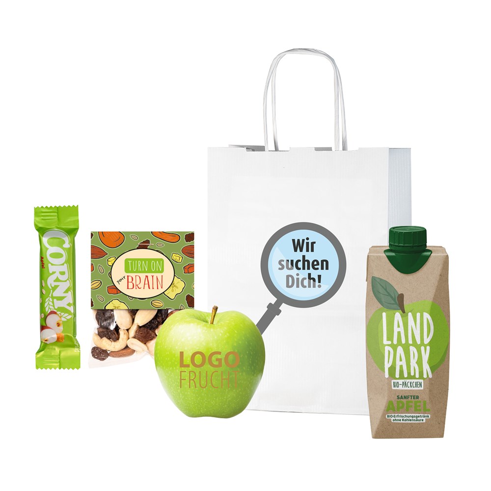 1 LOGOFrucht Apfel grün inkl. LOGOFrucht-Druck Strawberry, 1 Papiertragetasche mit gedrehten Papierkordeln inkl. Standard-Druck "Apfel", 1 Corny Riegel Apfel 25 g, 1 Beutel Studentenfutter 40 g und 1 Landpark Bio-Quelle Sanfter Apfel 500 ml (Erfrischungsgetränk, stilles Bio-Mineralwasser mit Apfel-Geschmack) • Der Apfel wird mit einem schonenden Druckverfahren und hochwertigen Lebensmittelfarbstoffen bedruckt, es stehen 6 Druckfarben zur Verfügung: Raspberry, Kiwi, Strawberry, Hazelnut, Blackberry und Goldberry. Im Gegensatz zur Lasergravur wird die Schale des Apfels nicht beschädigt und er bleibt länger frisch und saftig. Die Papier-Tüte kann auf der Vorderseite optional mit einem 4c Druck individualisiert werden.
