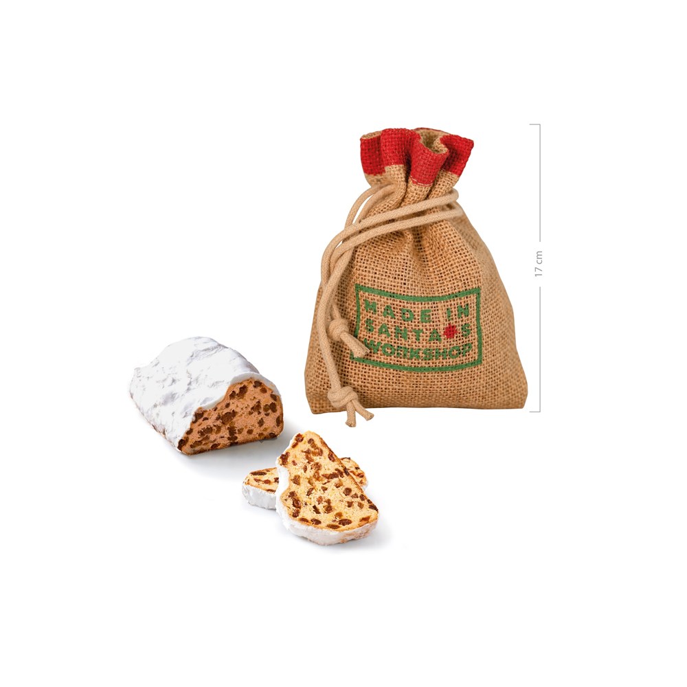 1 Gourmet-Christstollen 80 g verpackt im hochwertigen Jutesäckchen mit Kordel. • Der Gourmet-Stollen wird aus erlesenen Zutaten gebacken und kann auf der transparenten Verpackung mit einem 4c Etikett individualisiert werden. Das Jutesäckchen kann mit einem Anhänger 4c Digitaldruck an der Ziehkordel veredelt werden.
