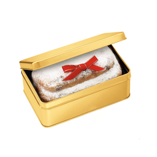 1 hochwertige, goldene Stülpdeckeldose mit Schleifenband rot, gefüllt mit: 1 Gourmet-Christstollen 200 g. • Der Gourmet-Stollen wird aus erlesenen Zutaten gebacken und kann optional auf der transparenten Verpackung mit einem 4c Etikett individualisiert werden. Die Goldbox kann mit einem 1c Druck und mit einem 4c Etikett auf dem Deckel oder mit einem 4c Anhänger am Schleifenband veredelt werden.