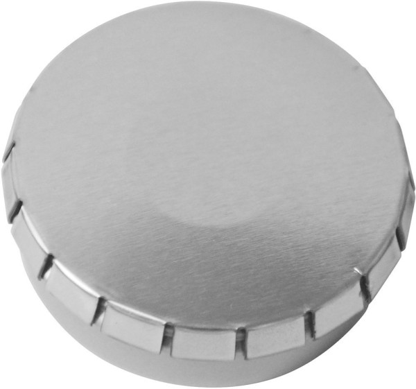 Metalldose weiß oder silberfarben, rund, wiederbefüllbar, einzeln gesleevt mit roter Aufreißhilfe.