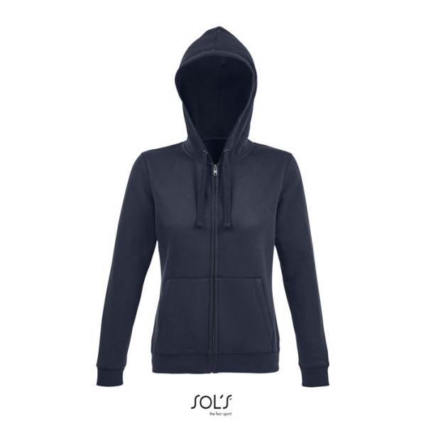 SOL'S SPIKE WOMEN. Damen Hoodie/Kapuzenjacke mit durchgehendem Reißverschluss. 80% ringgesponnene Baumwolle - 20% Polyester, angeraute Innenseite. Außen: 100% Baumwolle FLEECE 280 LSF (Low Shrinkage Fabric). Angesetzte Ärmel, 2 Känguru-Taschen auf der Vorderseite, geschnitten und genäht, Gefütterte Kapuze mit Ton-in-Ton-Kordelzug, Rippenbündchen am Saum und an den Ärmeln 2x2. Halbmondpasse auf der Krageninnenseite, Nackenband auf der Krageninnenseite, YKK-Reißverschluss. OEKO-TEX®. Verkauf nur mit Druck.