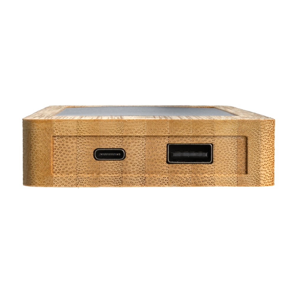 10.000 mAh Solar-Powerbank aus 100% FSC-Bambus. Die Powerbank verwendet hochwertige monokristalline Solarzellen mit einer Umwandlungsrate von 19%. Die Ladegeschwindigkeit hängt von den Umgebungsbedingungen ab. Die Powerbank enthält eine langlebige A-Grade Lithium-Batterie mit 10.000 mAh. Aufladegeschwindigkeit Solar: 5V/180mA. Input Type-C: 5V/2A. Output: USB-A: 5V/2A; Type-C: 5V/2A. Artikel und Zubehör PVC-frei. Inklusive RCS-zertifiziertem recyceltem TPE-Ladekabel. Verpackt in FSC®-Mix-Verpackung.