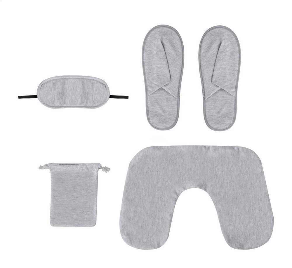 Reiseset aus Polyester in einem RPET-Polyester-Beutel mit Kordelzug. Inklusive aufblasbarem Reisekissen, Augenmaske und Hausschuhen in Einheitsgröße (36-43).