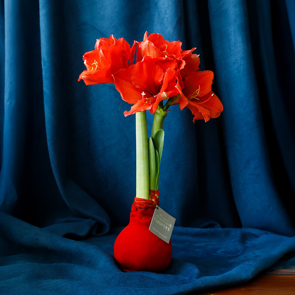 No Water Flowers® sind ein luxuriöses, wachsendes und blühendes Geschenk. Diese No Water Flowers Velvet Touchz®-Variante verfügt über eine samtige Oberfläche, die der Zwiebel ein weiches Gefühl und ein luxuriöses Aussehen verleiht. Diese speziell ausgewählten und getesteten Amaryllis-Zwiebeln haben genug Energie, um ohne Wasser zu wachsen und zu blühen. Authentische No Water Flowers® haben relativ kurze Blütenstiele, fallen nicht um und blühen garantiert. Jede No Water Flowers® wird sorgfältig gereinigt und perfekt gewachst. Dadurch erhält die Blumenzwiebel ein zeitgemäßes und modisches Aussehen.