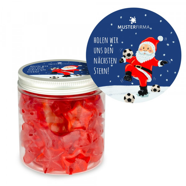 Lieferzeit: 14 Werktage nach Druckfreigabe Haltbarkeit: 12 Monate bei sachgerechter Lagerung Inhalt: 195 g Fruchtgummisterne mit Glühweingeschmack (alkoholfrei) Druckfläche: ø 60 mm, Etikett auf Deckel Größe: 77 mm hoch, ø 70 mm VPE: 24