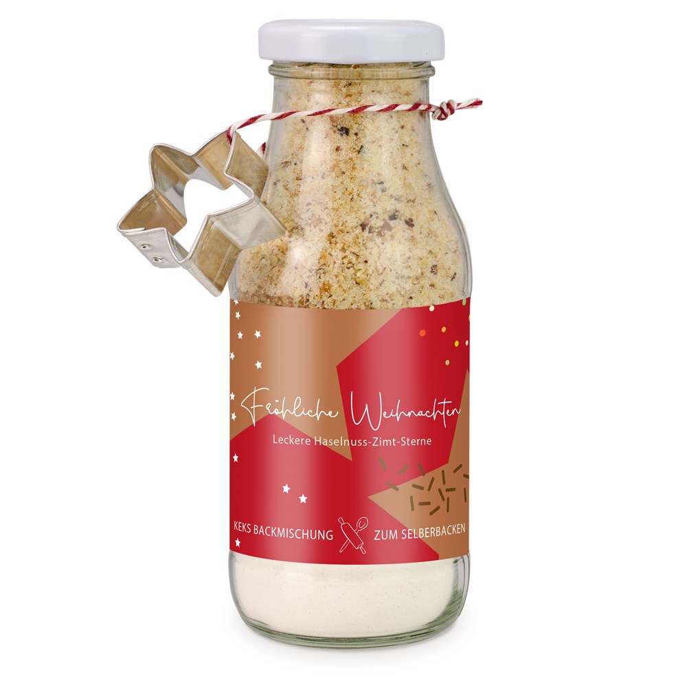 Lieferzeit: 14 Werktage nach Druckfreigabe Haltbarkeit: 4 Monate bei sachgerechter Lagerung Inhalt: 190 g Backmischung für Haselnuss Zimt Plätzchen Druckfläche: 165 x 60 mm, Sleeveetikett Größe: 155 mm hoch, ø 60 mm VPE: 8