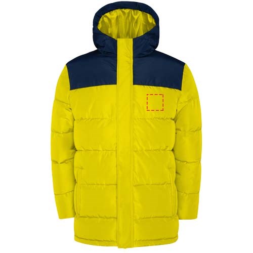 Wattierte Jacke mit fester Kapuze. Reißverschluss auf der Vorderseite, verdeckt durch eine Knopfleiste. Kinnschutz. Zwei Seitentaschen mit Reißverschluss. Elastische Bündchen.
