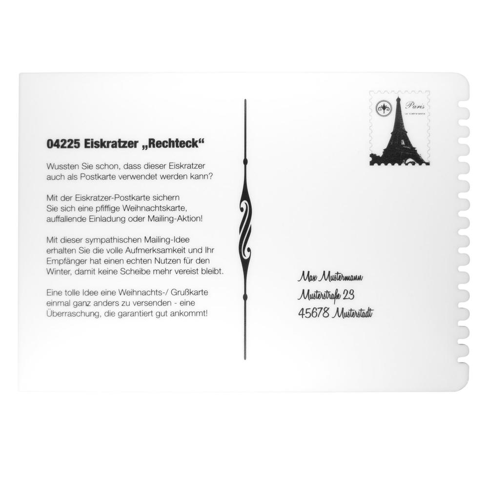 Flacher, rechteckiger Eiskratzer mit großer Werbefläche, Kratzzähnen und glatter Kratzkante. IMould-Veredelung möglich.
