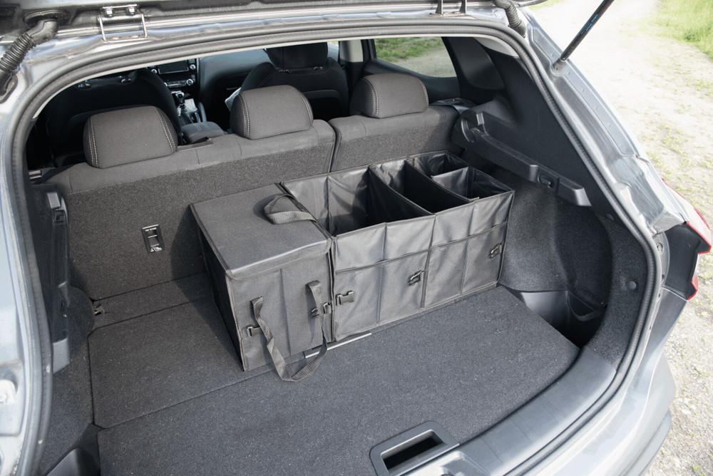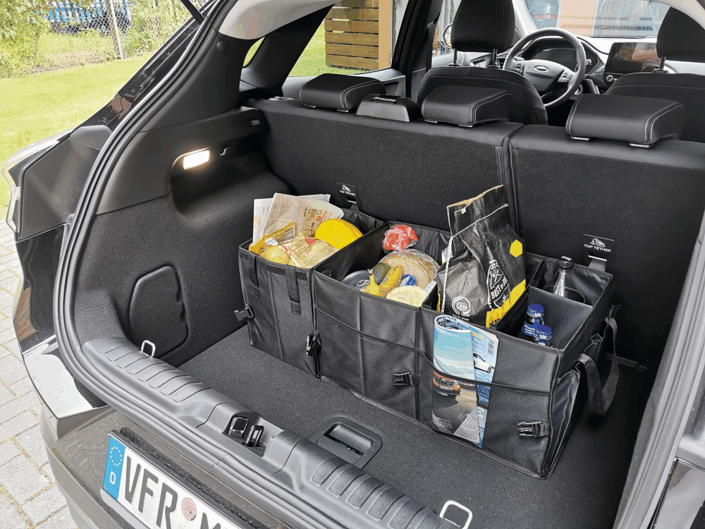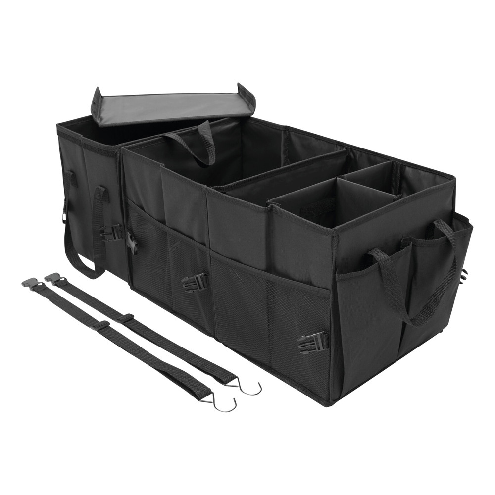 Kofferraumtasche SUPER GADGET: faltbares Design, bestehend aus 2 Taschen, die durch Klettverschluss miteinander verbunden werden können, 1 Tasche mit Deckel und Tragegriffen, 1 große Tasche mit 3 flexiblen Zwischenwänden, Tragegriffen, 2 seitlichen Steckfächern und Netzvorfächern, verstärkte Bodenplatten, 2 Gurte und zahlreiche Clips, Klettverschluss am Boden für eine Befestigung im Auto