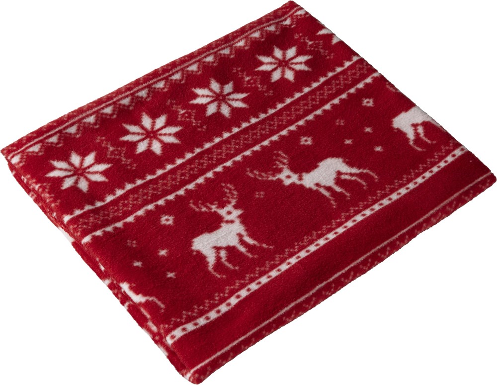 Decke 'Snuggle' aus Fleece (180 g/m²) im winterlichen Rentier-Design. Die Decke verfügt über einen Nylon-Tragegurt, der gleichzeitig als Werbefläche dient.