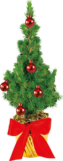 Eine lebende Zuckerhutfichte 20 - 30 cm, verpackt in einer Einzelversandkartonage, als kleines Bäumchen zu Weihnachten. Klassisch und dekorativ versetzt diese Zuckerhutfichte jeden Raum in eine weihnachtliche Stimmung. Das Bäumchen kann auf Wunsch von uns direkt an einzelne Empfänger versendet werden. Geschmückt ist das Bäumchen mit 5 roten Weihnachtskügelchen. Deko für den Topf: Topffolie gold, Schleife rot. Die Farben der Kugeln (rot, orange, blau, silber), Schleifen (rot, orange, blau, gold, silber) und Topffolien (gold, silber, Jute, Naturpapier) sind beliebig kombinierbar. Ein Werbeeindruck kann auf unserem Anhängekärtchen Artikel 6202 (40 x 60 mm) ab 100 Stück erfolgen oder auf einer Beilage nach Wunsch. Zudem steht als Werbefläche ein separater Schuber, Art.-Nr. 4199-8, zur Verfügung. Inhalt: Bäumchen 20-30 cm geschmückt mit 5 roten Weihnachtskügelchen, Topffolie gold, Schleife rot