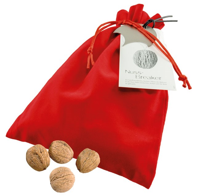 Sehr edel ist dieses Nuss-Säckchen mit rotem Samtsäckchen, ca. 100 g Walnüssen und Edelstahl-Nussbreaker. Der Werbeandruck ab 100 Stück erfolgt auf dem Standardmotiv des Anhängekärtchens. Eine eigene Gestaltung des Kärtchens kann ab 100 Stück realisiert werden. Zudem besteht die Möglichkeit für einen Tampondruck oder eine Lasergravur auf dem Edelstahl-Nussknacker, der nachhaltig in Erinnerung bleibt. Inhalt: ca. 100 g Walnüssen, Edelstahl-Nussbreaker, Anhängekärtchen
