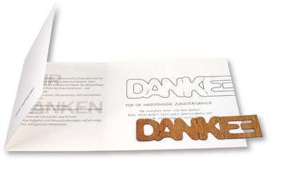 Mit dieser Weihnachtskarte können sie ganz einfach "Danke", z. B. für die harmonische Zusammenarbeit, sagen. Das Holzlesezeichen kann nachhaltig genutzt werden und ist so immer wieder präsent. Eigene Schriftzüge sind nach Vorlage ab 250 Stück möglich. Platz für den Werbedruck ist auf dem Standardmotiv der Karte oder eine eigene Gestaltung, jeweils ab 100 Stück. Ein Kuvert ist separat erhältlich, Artikel 6101 Inhalt: Holzlesezeichen 'DANKE' (ca. 105 x 24 mm)