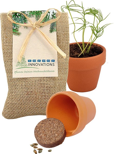 Ein Stück Natur beinhaltet dieses kleine Jutesäckchen. Neben der Pflanzanleitung ist alles dabei für die Anzucht einer kleinen Fichte-Pflanze: Tontopf 4 cm, Samen und Erdtablette. Platz für den Werbedruck ist auf dem Standardmotiv des Headers oder eine eigene Gestaltung, jeweils bereits ab 250 Stück. Inhalt: Tontöpfchen Ø 4 cm, Erdtablette, Samen: Fichte