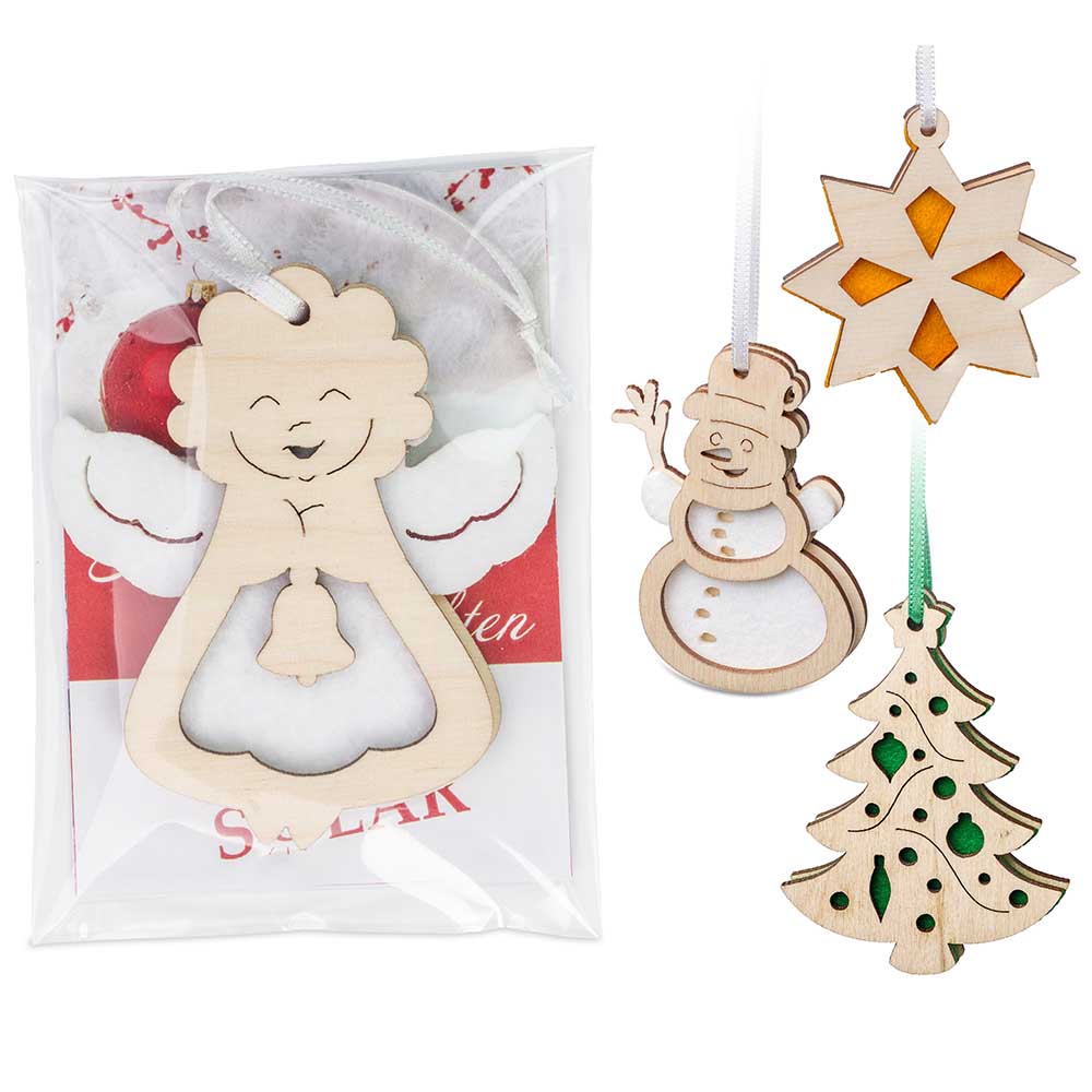 Wie vom Christkindlemarkt! Die Holz-Filz Anhänger, in den Formen Stern, Baum, Schneemann oder Engel, bringen ein gemütliches Ambiente an den Christbaum oder in das adventlich geschmückte Fenster Ihres Kunden. Die Anhänger werden in Europa produziert und sind in einer Werbetüte erhältlich. Dazu gehört ein beidseitig bedruckbarer Einleger, der individuell gestaltet werden kann. Ideal für die Weihnachtsbotschaft an Kunden zum Jahresende!